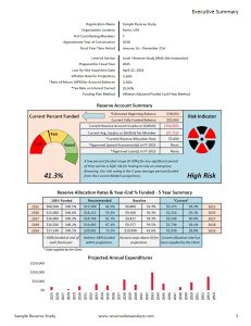 The findings of the reserve study are summarized for the reader. This includes a percent funded calculation and an ideal reserve account balance (Fully Funded Balance) and a risk assessment indicator. A 5-year summary of the funding models can be also be found here.