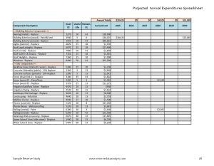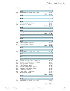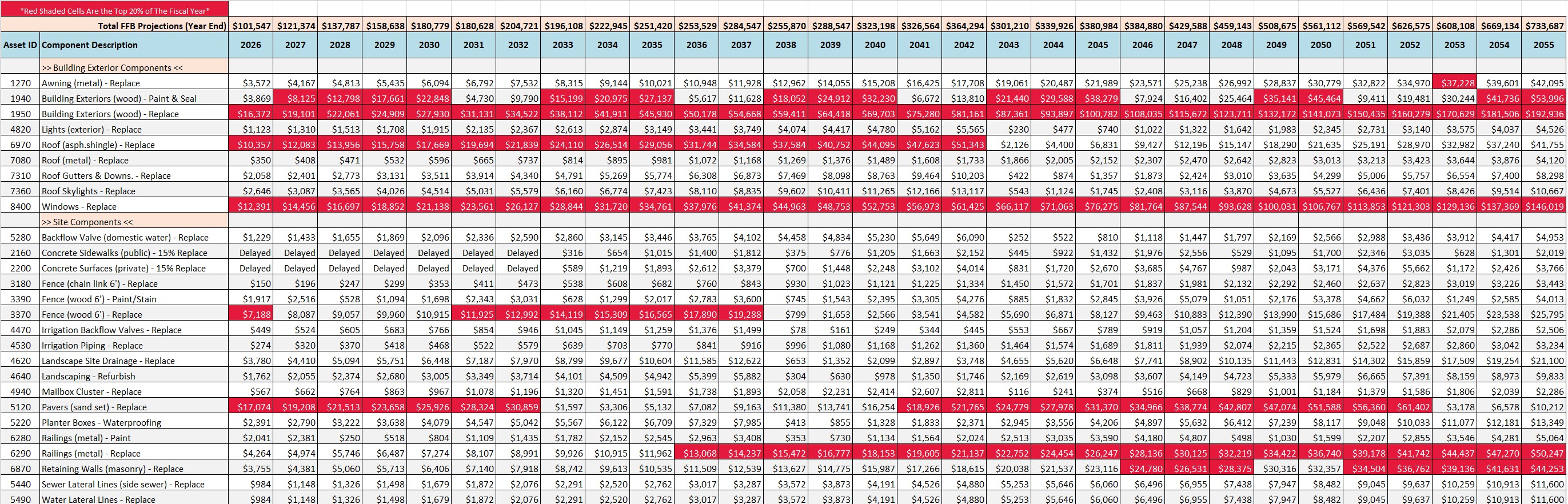 Projected annual expenditures indicated by components repair / replacement projects in each year of the reserve study as well as total accumulated projected costs associated with them in each of those years. The expenditure reports are provided in various formats including a chart & spreadsheet over the thirty years covered in the study.