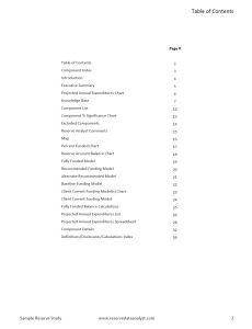 The Table of Contents lists each section of the reserve analysis study with the corresponding page number the section begins on. Utilize it to easily navigate throughout the reserve study. This along with the Component Index are excellent navigational tools we provide to our Clients in each reserve study.